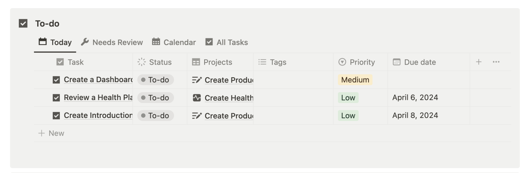 • Task Management: Within each project, add tasks as database entries. Define tasks with deadlines, assignees, and statuses to track progress dynamically.