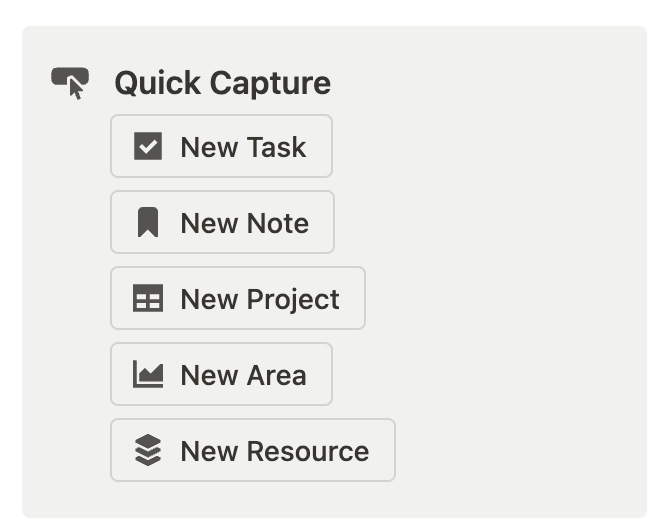• Resources: This category is for information that you think might be useful to keep for future reference but doesn’t belong in your active projects or areas. Common resources include articles, ideas, notes, and other reference materials.